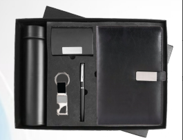 1 × Matte black thermal bottle 1 × Signature black pen 1 × Black card holder 1 × Sleek keychain 1 × Hardcover diary 1 × Presentation box